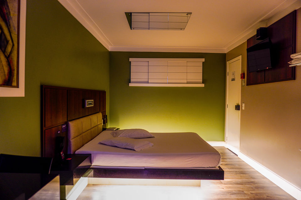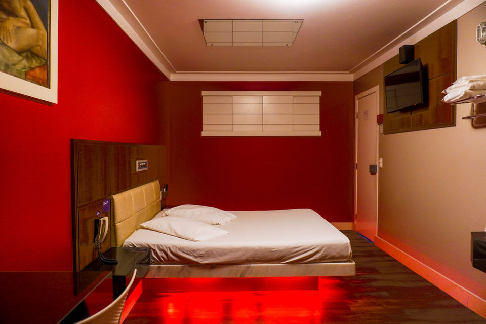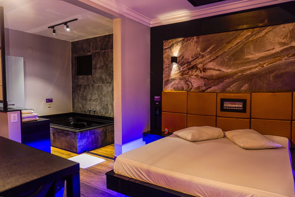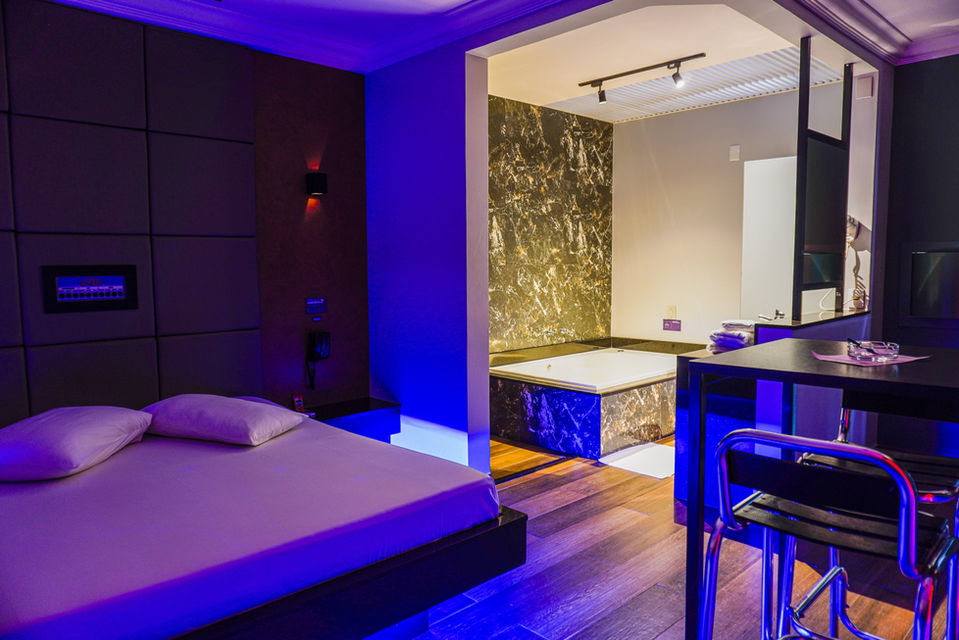 Pole dance | Ducha dupla | Bar | Banheira com cromoterapia | Bluetooth | WiFi | Frigobar | Ar condicionado | TV e canais eróticos | Banheiro integrado